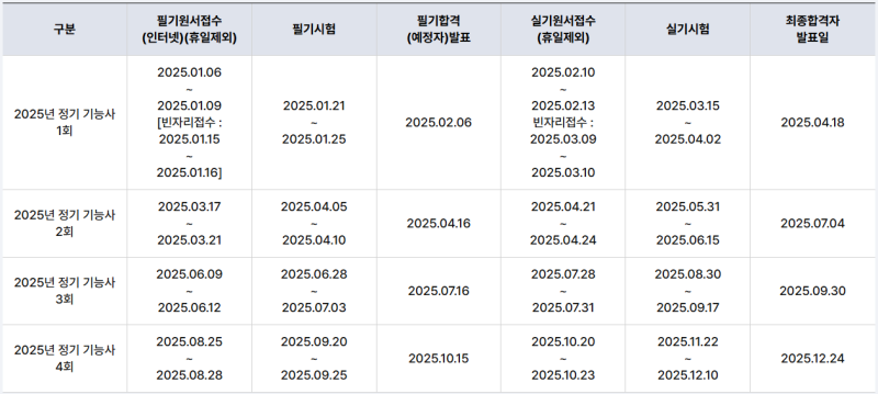 시험은 연간 여러 차례 시행되며, 시험 일정은 한국산업인력공단의 Q-Net 홈페이지를 통해 확인할 수 있습니다. 필기 시험에 합격한 사람만 실기 시험에 응시할 수 있습니다.